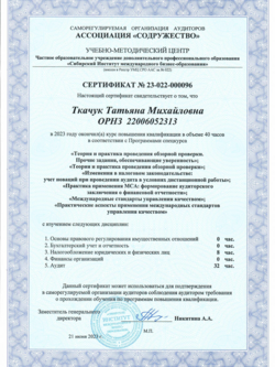 Сертификат аудитора Ткачук Т.М. о повышении квалификации 2022г.