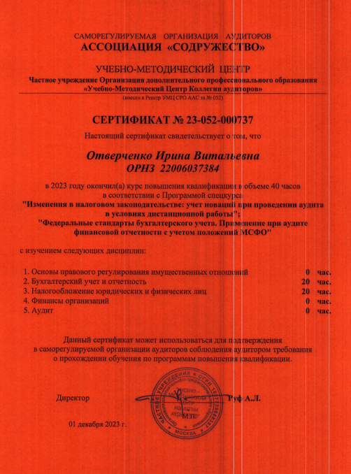 Сертификат аудитора Отверченко И. В. о повышении квалификации 2023г.