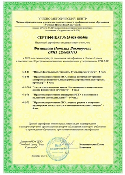 Сертификат аудитора Филипповой Н.В. о повышении квалификации 2025г.