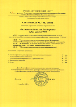 Сертификат аудитора Филипповой Н.В. о повышении квалификации 2024г.