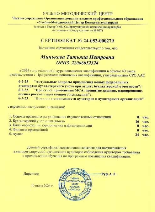 Сертификат аудитора Миньковой Т.П. о повышении квалификации 2024г.