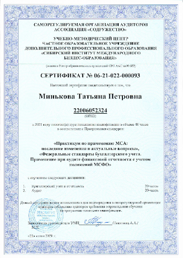 Сертификат аудитора Миньковой Т.П. о повышении квалификации 2021г.